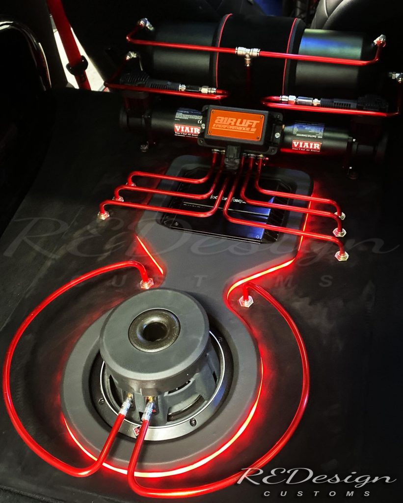 The interior of the car has had an extensive overhaul with the dashboard, headlining, door cards & sun visors being re-trimmed in a swathe of black milano and leather with red detail stitching. To add to the accents, bluetooth controllable LEDs in the footwell and around the amp & subwoofer make sure the mood is set. The boot build has been custom made in-house and makes the Airlift Performance 3P system, Rockford Fosgate Subwoofer & Amp feel at home with the rear seats deleted.